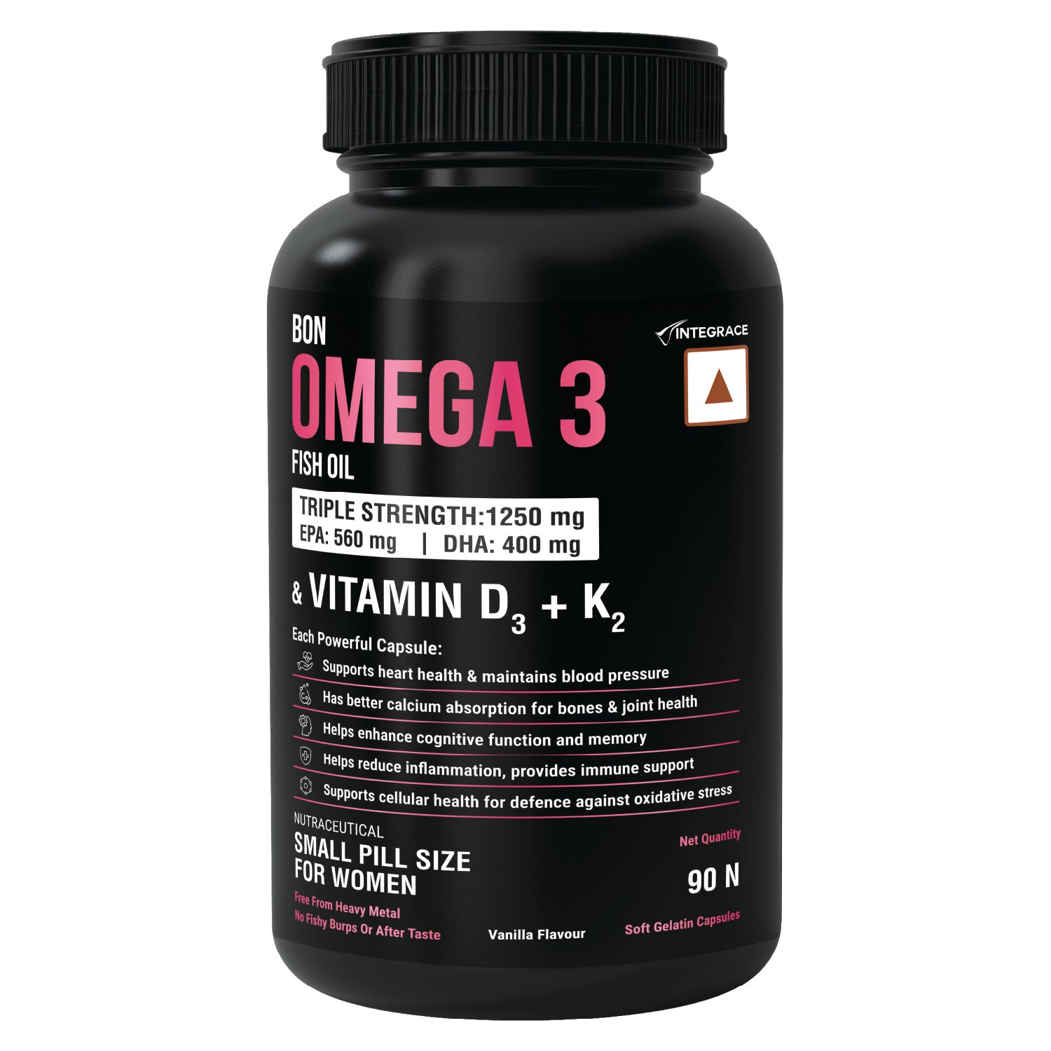 BON Omega 3 Fish Oil for Women 1250mg with Vitamin D3 & K2 – Easy to Swallow Smaller Softgels | 3X Triple Strength 560mg EPA & 400mg DHA | Supports Heart, Bone Health, Brain, Immunity, Healthy Skin & Hair | 90 Softgels | Non-GMO, Burpless, Anti-Reflux
