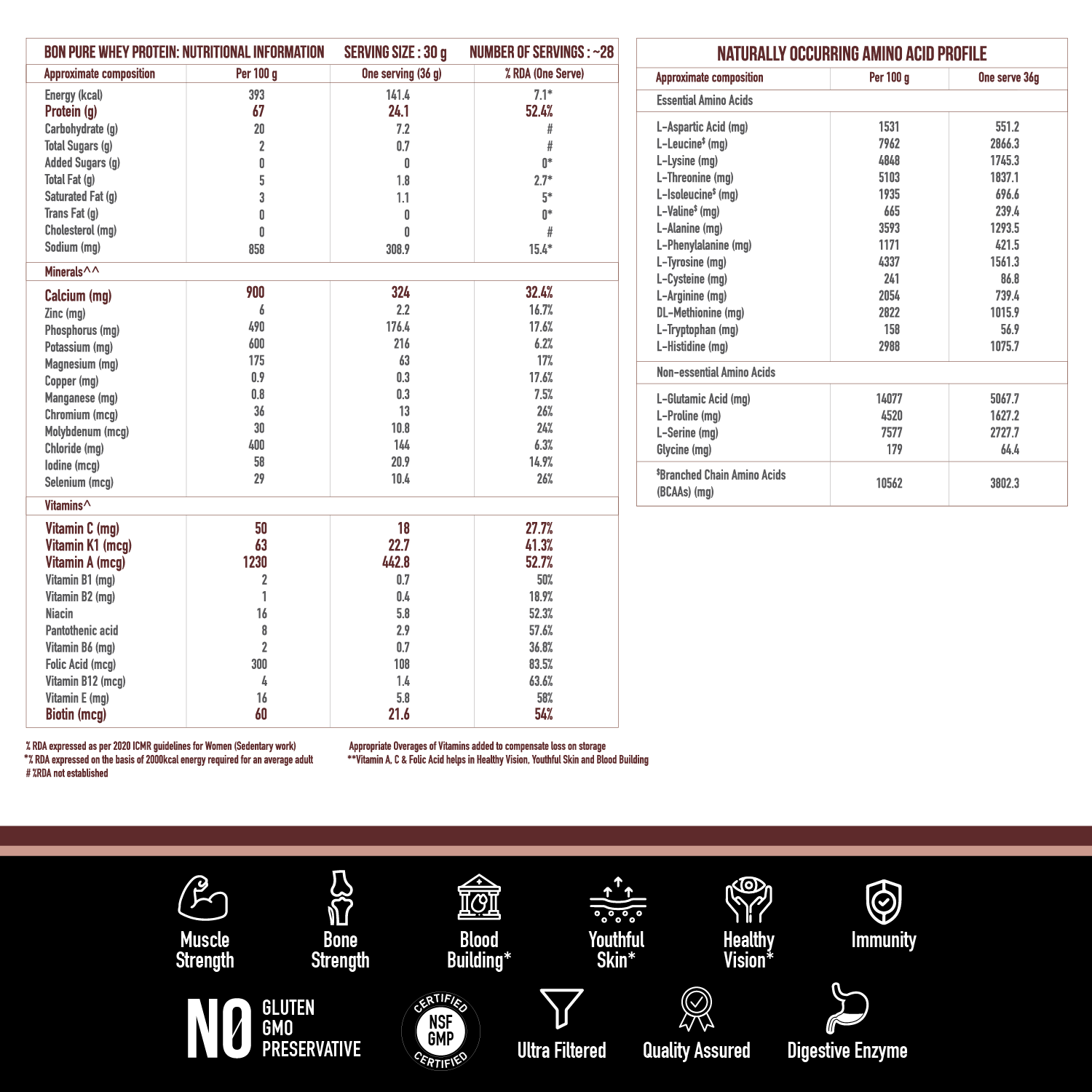 - YOU DESERVE MORE: Bon PURE Whey is enriched with Vit-K1 for Bone health, Biotin and Vit-C for Healthy Vision, Strong Immunity, Vit-E for strengthening Natural Defence. It has adequately added Vit-B6 for Haemoglobin and BCAA for muscle recovery. Essentials Vit and minerals like Vit B-Complex, Magnesium, Phosphorous, Potassium, Sodium, Copper, Iodine, Chromium, Selenium, Chloride, Molybdenum and Manganese works hard to ensure an all-round performance. IT WORKS JUST AS HARD AS YOU DO