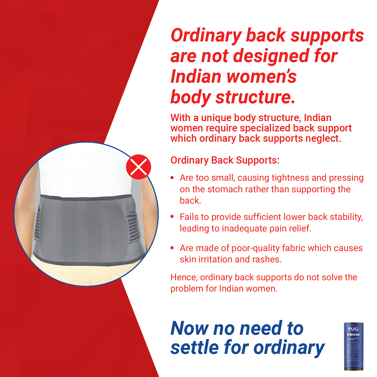 - ✅ The PUG Back Support Belt for Women is first ever ergonomically designed belt to suit the unique body structure of Indian Women. It is engineered for superior support with six robust aluminum rods that align the spine, reduce strain, and ensure long-lasting durability. Tailored for women with waist sizes ranging from 28 to 52 inches, its ergonomic design ensures a secure and comfortable fit, accommodating higher pelvic sizes without compressing the stomach. By focusing on stabilizing the lower back, the belt effectively prevents strain, delivering targeted support and promoting better posture.
