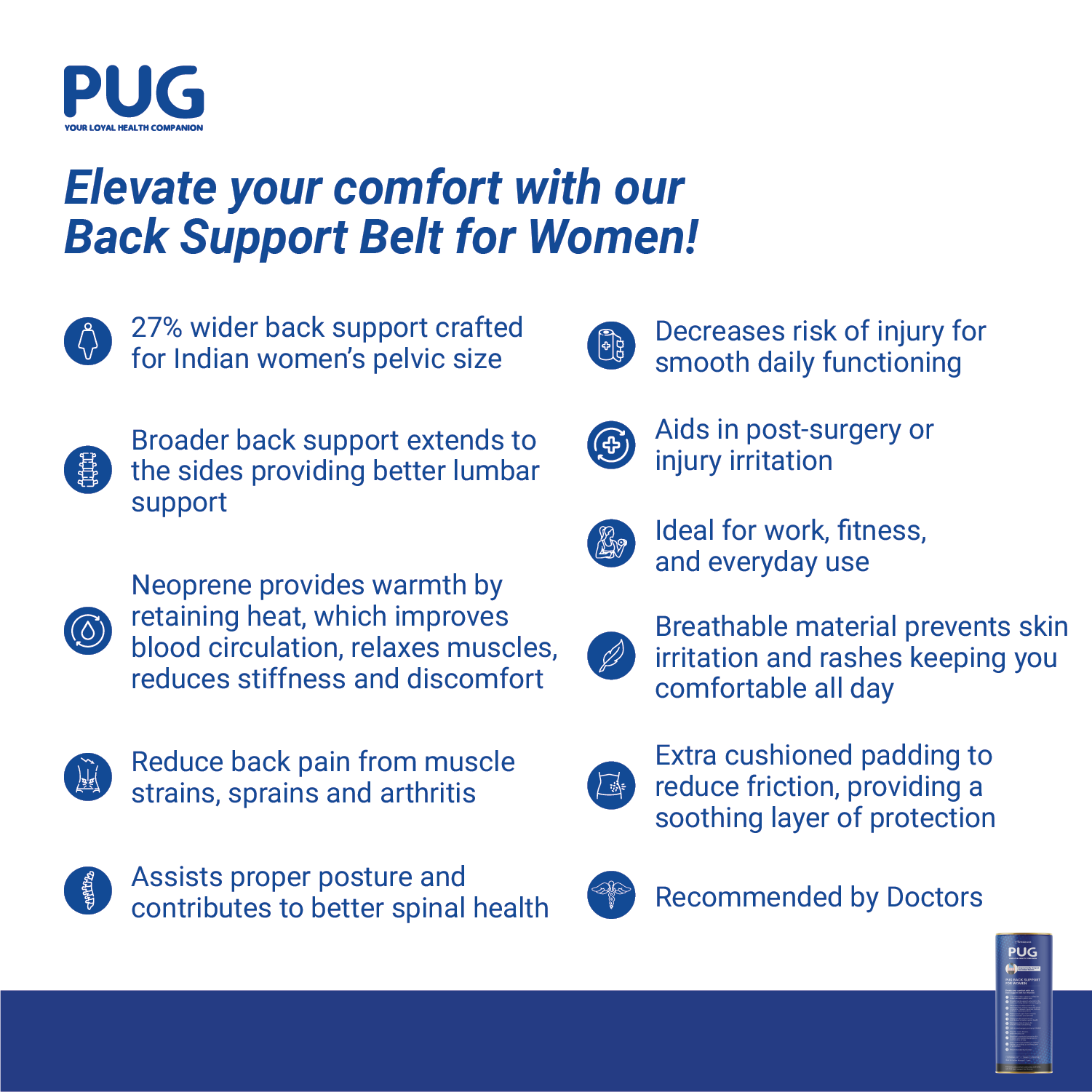 - ✅ Discover Unmatched Care: The PUG Back Support Belt for Women is crafted by Integrace Health, a company whose products are recommended by thousands of doctors in India. It surpasses strict quality standards, ensuring the right product for your needs. Experience the comfort and support you deserve to deal with Low Chronic Back Pain with the trusted PUG Back Support Belt for women.