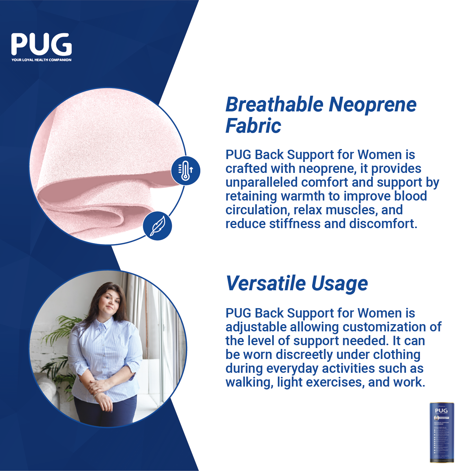 - ✅ The PUG Back Support Belt for Women is crafted from 100% neoprene with a 4.5mm thickness. The premium neoprene fabric provides exceptional thermal insulation, retaining body heat to relax tense muscles, boosts circulation, and accelerates recovery. It is also remarkably soft and gentle on the skin. This unique blend of heat-retaining properties and skin-friendly comfort ensures reduced risk of discomfort, rashes, or irritation, even with prolonged wear. Ideal for daily use, the PUG Back Support Belt for Women offers the perfect combination of durability, flexibility, and dependable all-day support