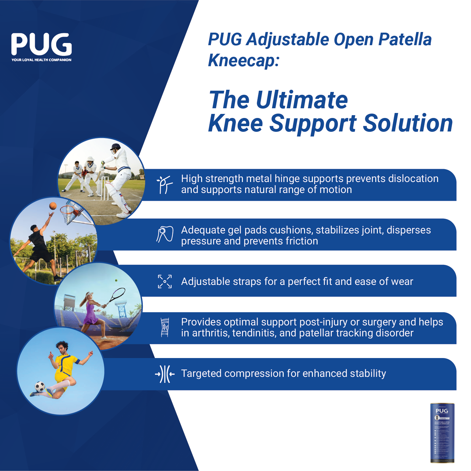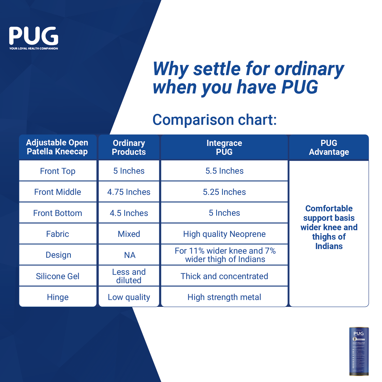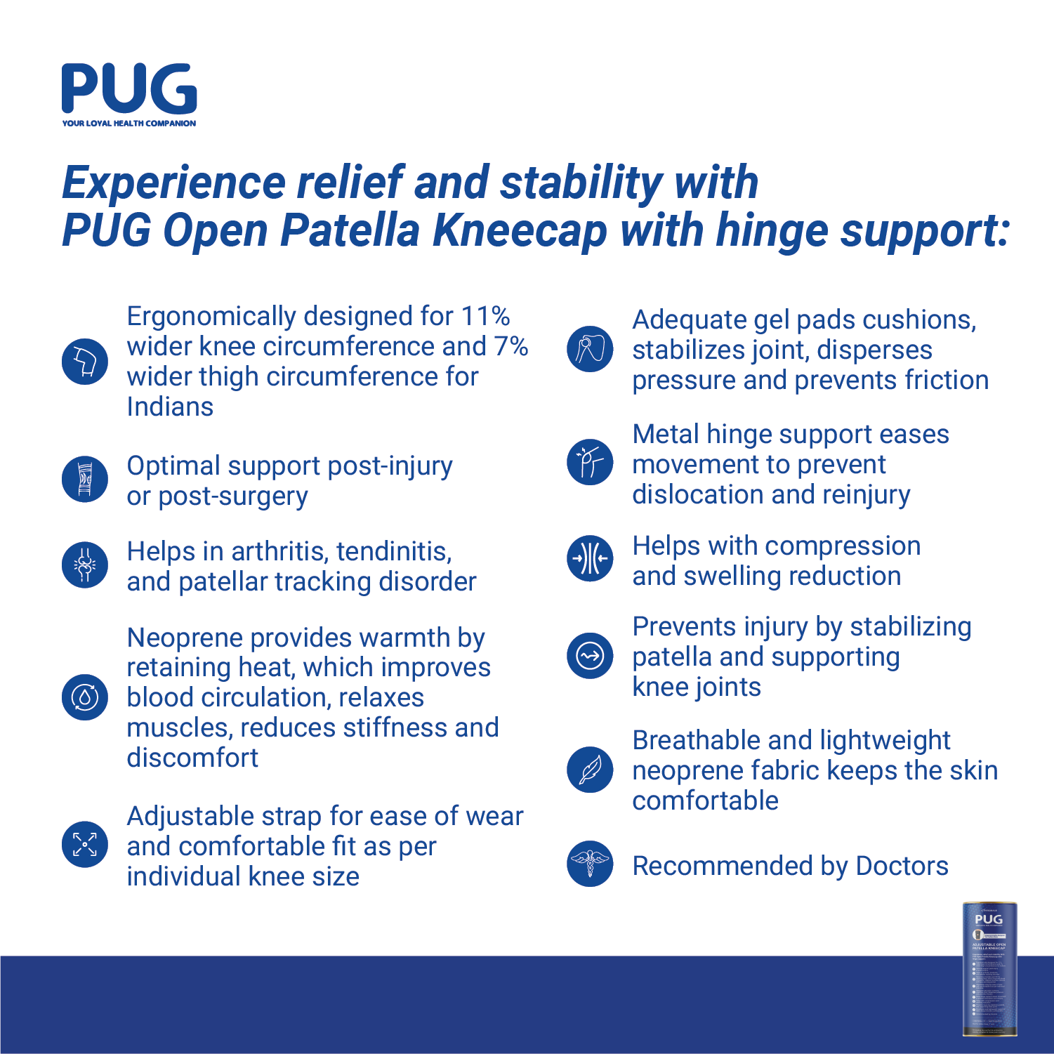 - ✅ Discover Unmatched Care: The PUG Open Patella Kneecap is crafted by Integrace Health, a company whose products are recommended by thousands of doctors in India. It surpasses strict quality standards, ensuring the right product for your needs. Experience the comfort and support you deserve to deal with knee pain with the trusted PUG Open Patella Kneecap.