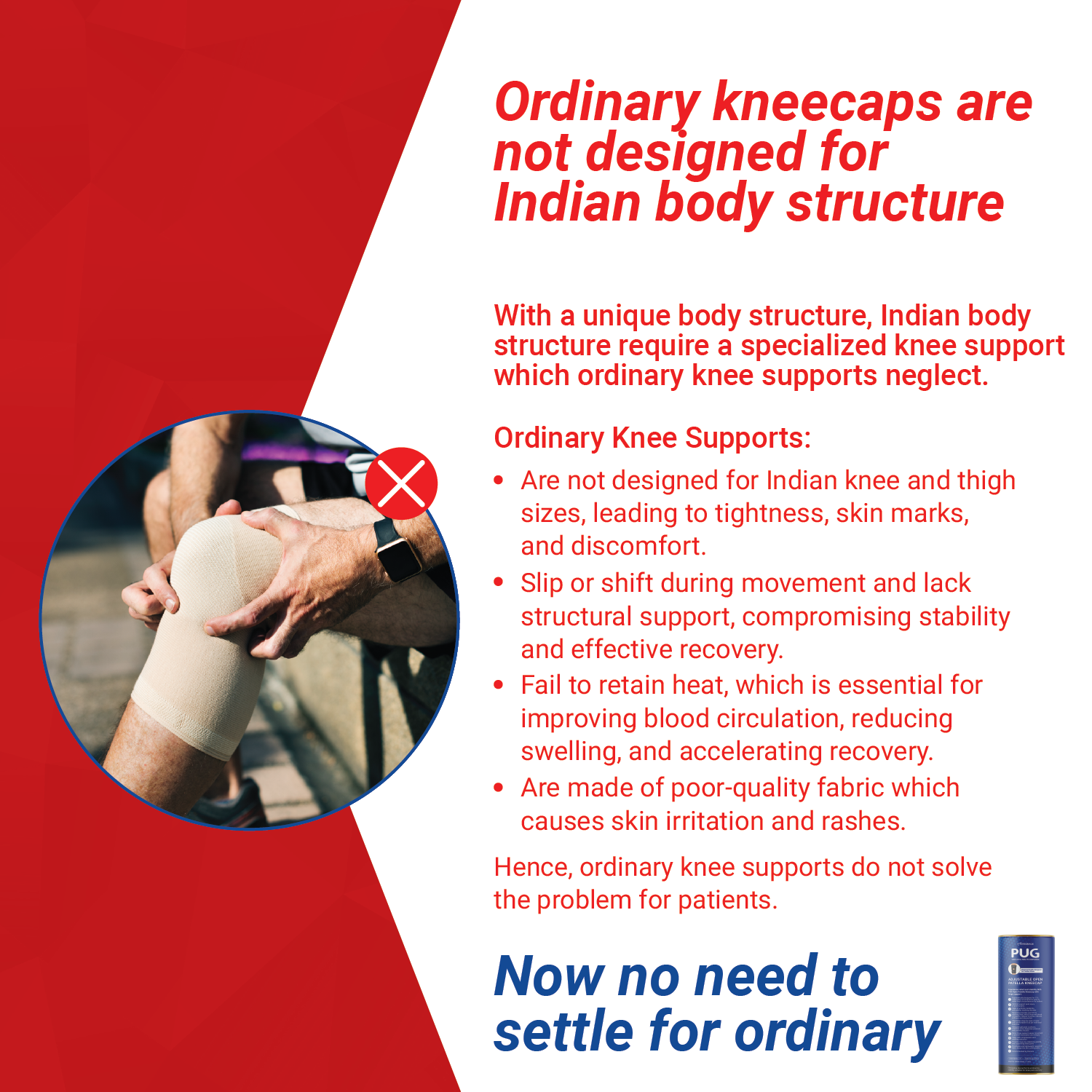 - ✅ Tailored Fit for Indian Knees: Specifically designed for the wider knee and thigh dimensions of Indian consumers (11% and 7% respectively). This significant difference is ignored by ordinary Knee Braces and are not customized for Indian Body Structures. PUG Open Patella Kneecap ensures a custom fit that eliminates discomfort from tight or misaligned braces. The snug, comfortable fit reduces skin irritation and allows for all-day wear, providing continuous support without any marks or rashes.