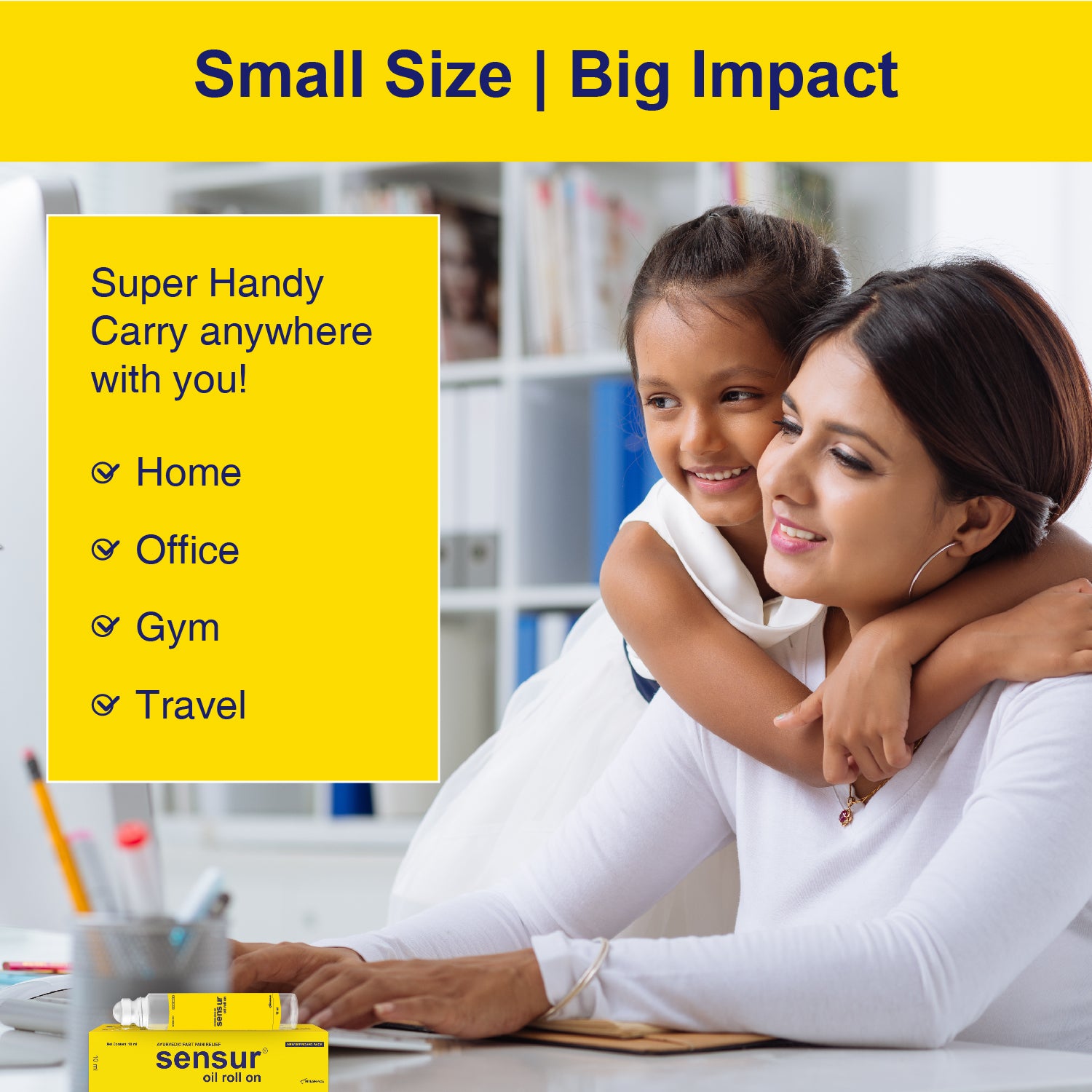 Effective and Fast ReliefSensur Pain Relief Oil Roll-On comes in a small, easy to carry size. Its absorption starts in seconds, and it penetrates deep for maximum relief. With its quick action and fast relief, never let pain ruin your routine |
