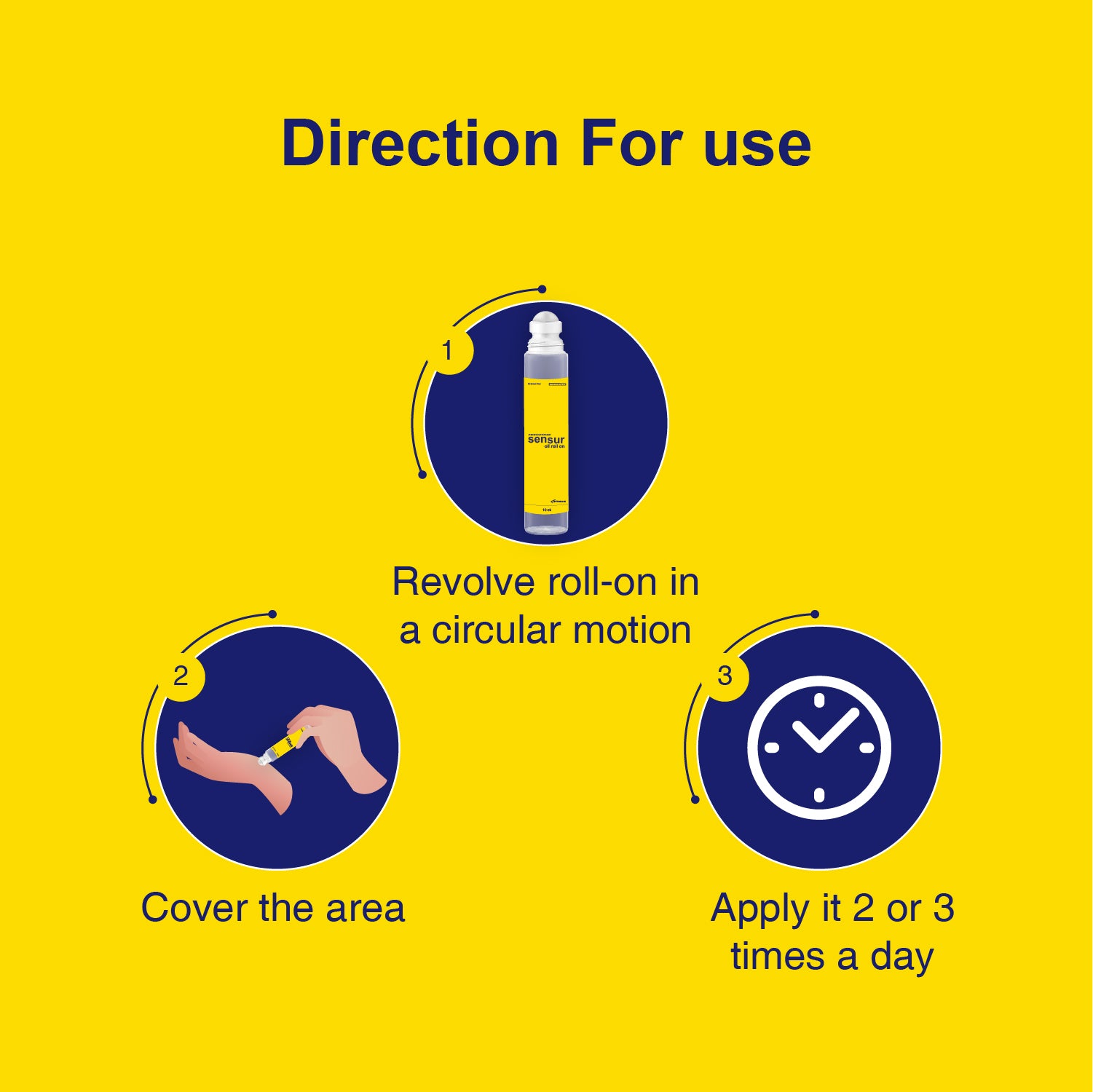 Easy To UseSensur Pain Relief Oil Roll-On is easy to use. Revolve the Roll-on in a circular motion and apply it on the affected area. Apply it 2 or 3 times a day or as suggested by your health expert. |